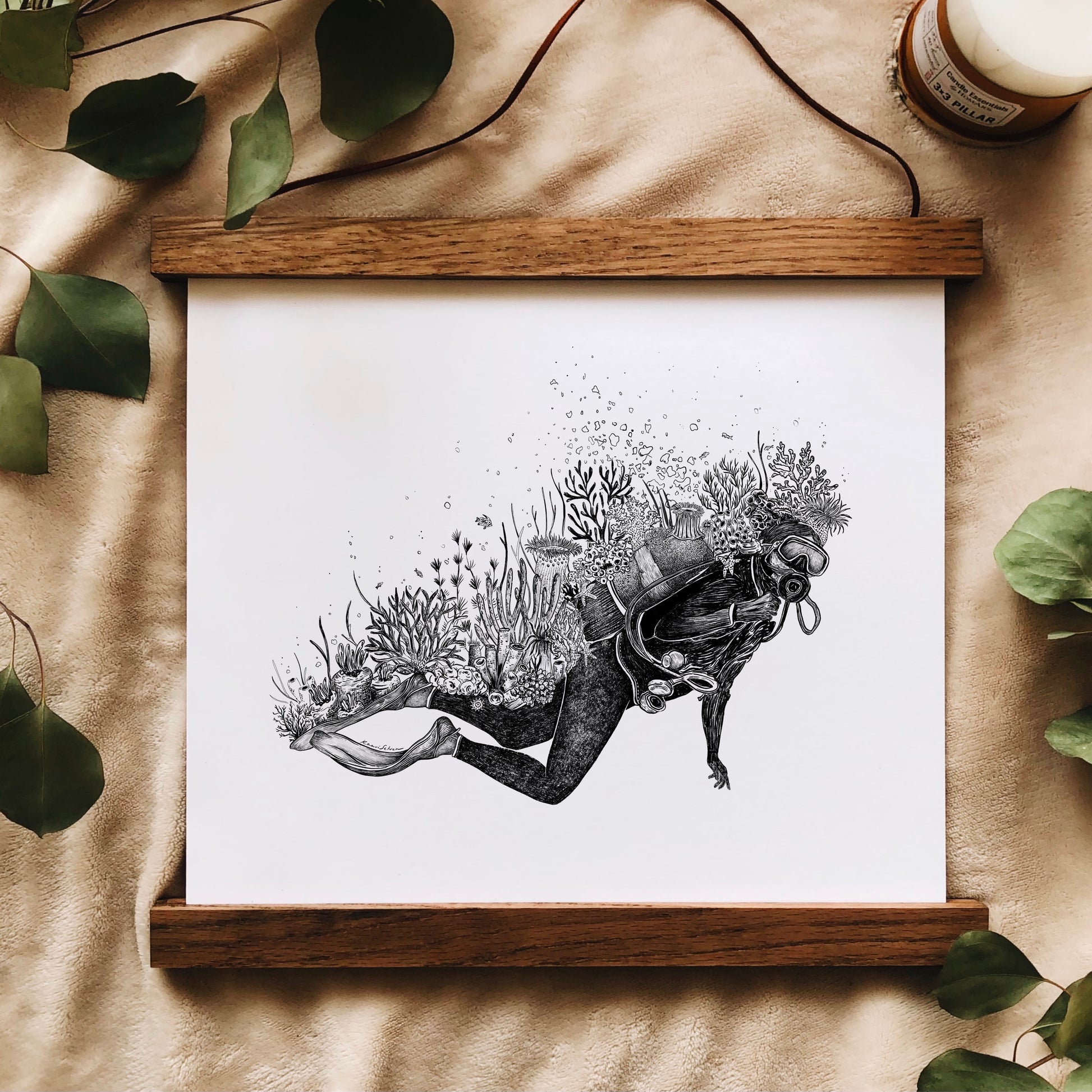 All print orders are shipped in recyclable, rigid mailers and are packaged in a clear, compostable bag with a recycled backing board to protect your new art during transit.